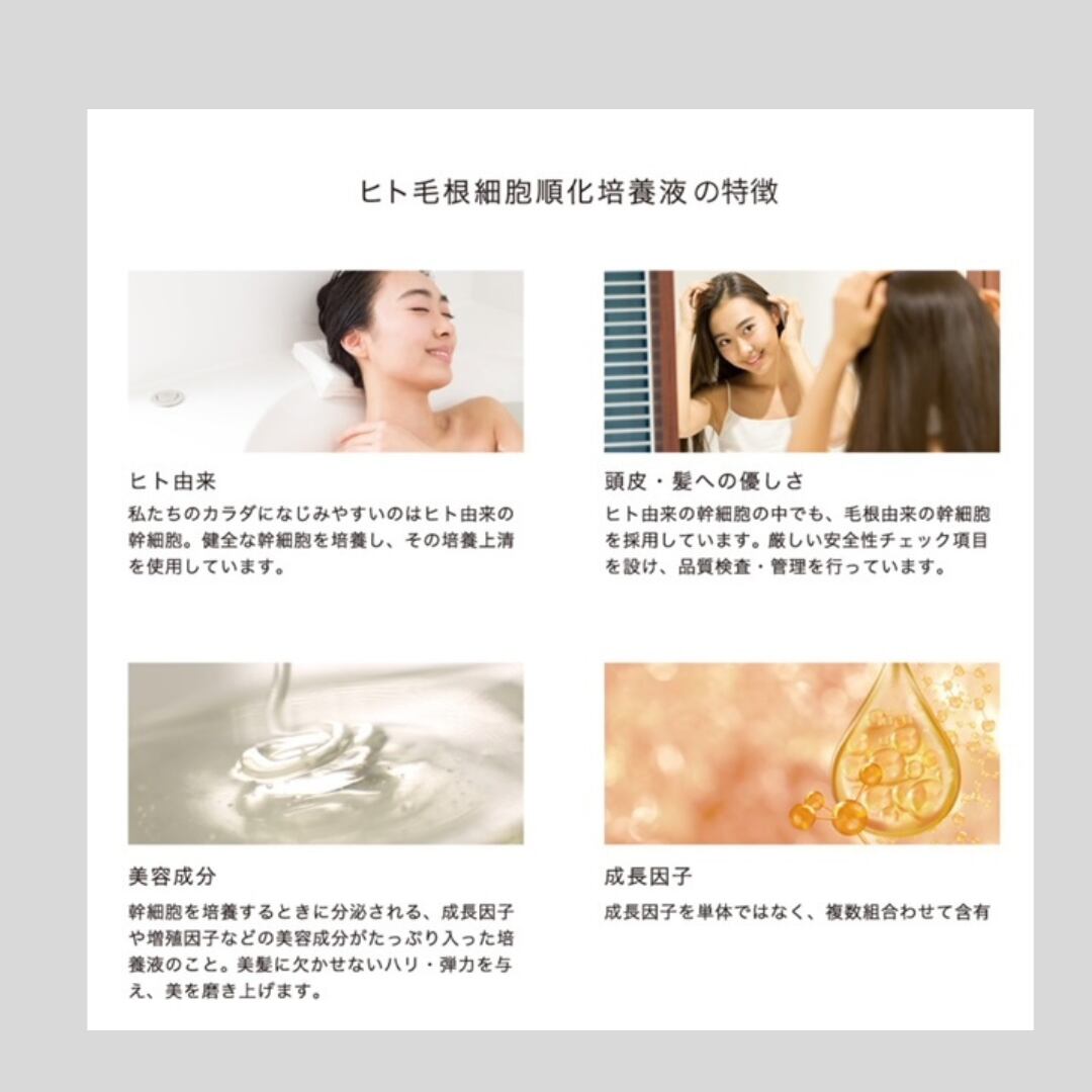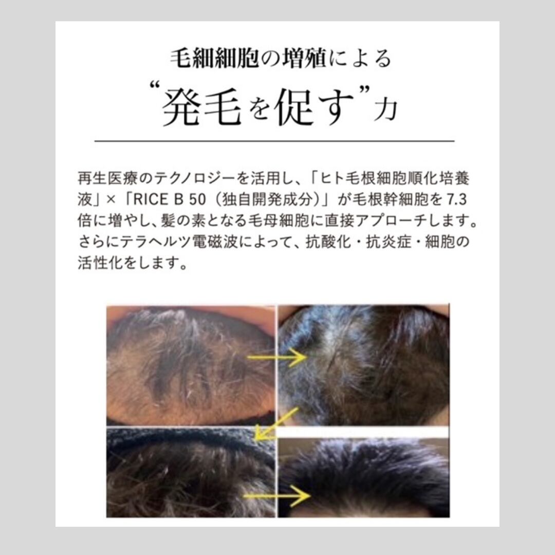 ヒト毛根幹細胞順化培養液の作用を、約7.3倍パワーアップさせることができるオリジナル成分RICE B 50との掛け合わせによってさらに発毛に必要な毛母細胞を増殖させる期待ができます。