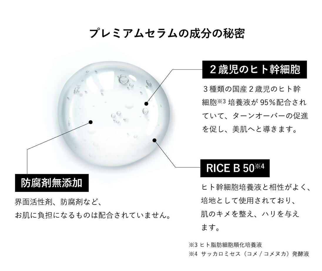 お米の潜在能力を開花させた独自成分をベースに、日本人の赤ちゃん由来のヒト角化細胞順化培養液(※皮膚コンディショニング剤として)を約95%配合した贅沢な美容液です。